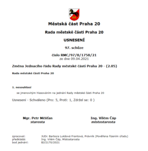 Rada MČ Praha 20 dne 9. 4. 2021 neschválila návrhy změny jednacího řádu ve věci zavedení jmenného hlasování Rady MČ Praha 20 (RMČ). Pro jmenné hlasování hlasoval pouze jeden člen RMČ a to paní místostarostka Eva Alexová.