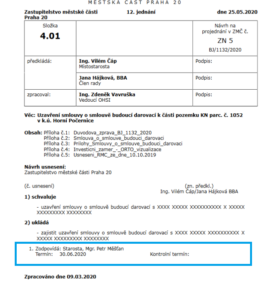 V červnu požádal projektant náš úřad o zajištění souhlasu s kácením na parc.č. 1589/3 (vlastník MČ Praha 20) 1ks třešně křovité s průměrem kmenu 76 cm a doložení souhlasu za pozemek parc.č. 1052. Jeho požadavek zůstal bez odpovědi, proto za dva měsíce (v srpnu letošního roku) projektant urgoval na úřadě vydání souhlasu za pozemky dotčené stavbou ve vlastnictví MČ Praha. Tento dokument je již poslední souhlas vlastníka pozemku, který pro úspěšné dokončení projednání chybí.